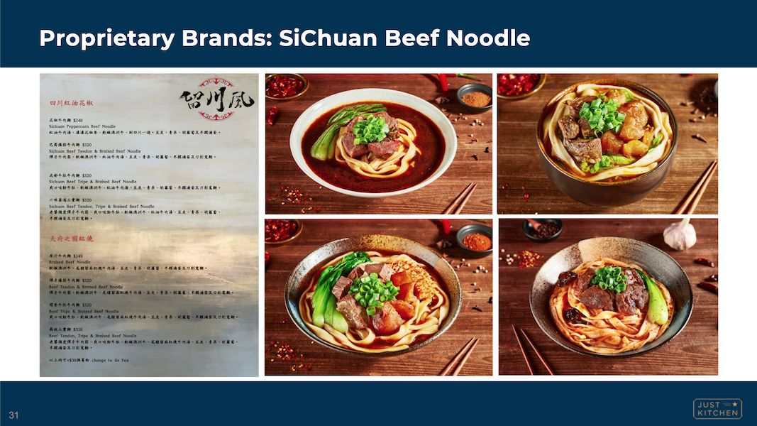 如此一來,中央廚房可設立在便宜的地區,並取得規模經濟。衛星店則能快速送餐到府。如下圖來自 Just Kitchen 上市簡報(以下同):Just Kitchen 直營中央廚房。中央廚房負責研發菜色、採購食材與集中準備。其自製品牌涵蓋台灣最受歡迎的外送食物類型,如牛肉麵(下圖)、咖哩飯、舒肥料理、珍珠奶茶等。其同時也跟外部品牌合作,例如鬍鬚張,由 Just Kitchen 負責「代工」外送。而衛星店則採加盟制。Just Kitchen 提供加盟商軟體、杯盤碗盒、標準作業流程與訓練。最重要的是訂單也是由總部分派,因此加盟商只是單純的出貨窗口。