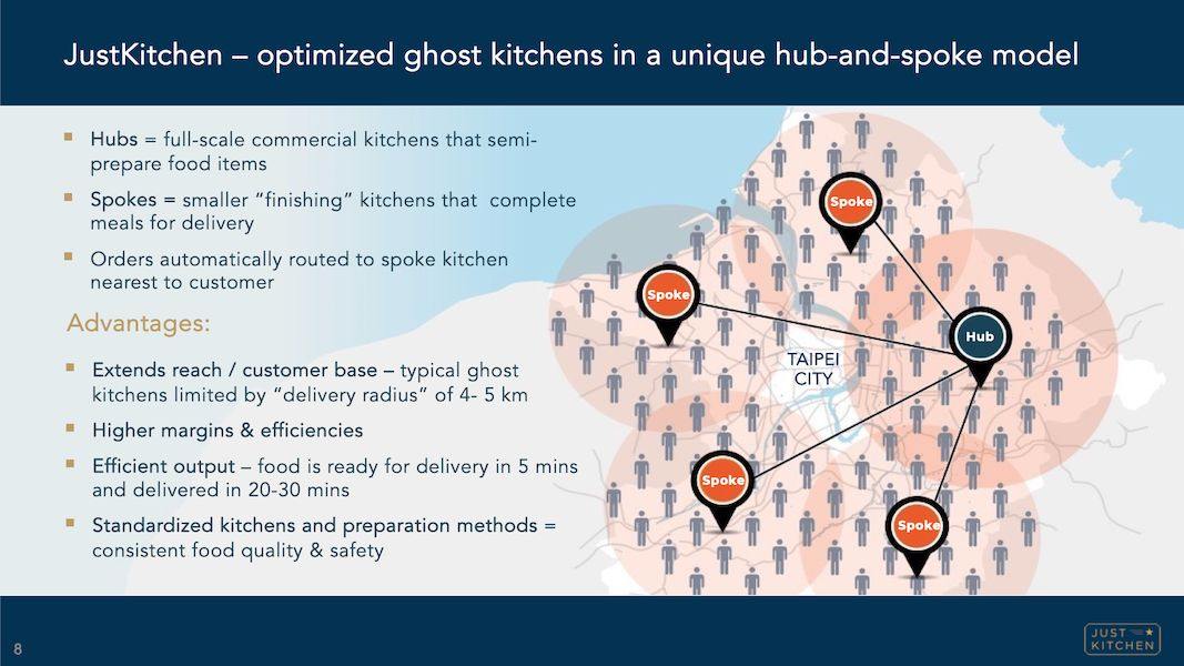 而 Just Kitchen 的作法是採中樞輻射(hub-and-spoke)架構。在大城市建立中央廚房(hub),負責製作餐點 的 85% 流程。然後送至各小區域的衛星店(spoke),負責送餐前的最後手續,如加熱、加醬等。